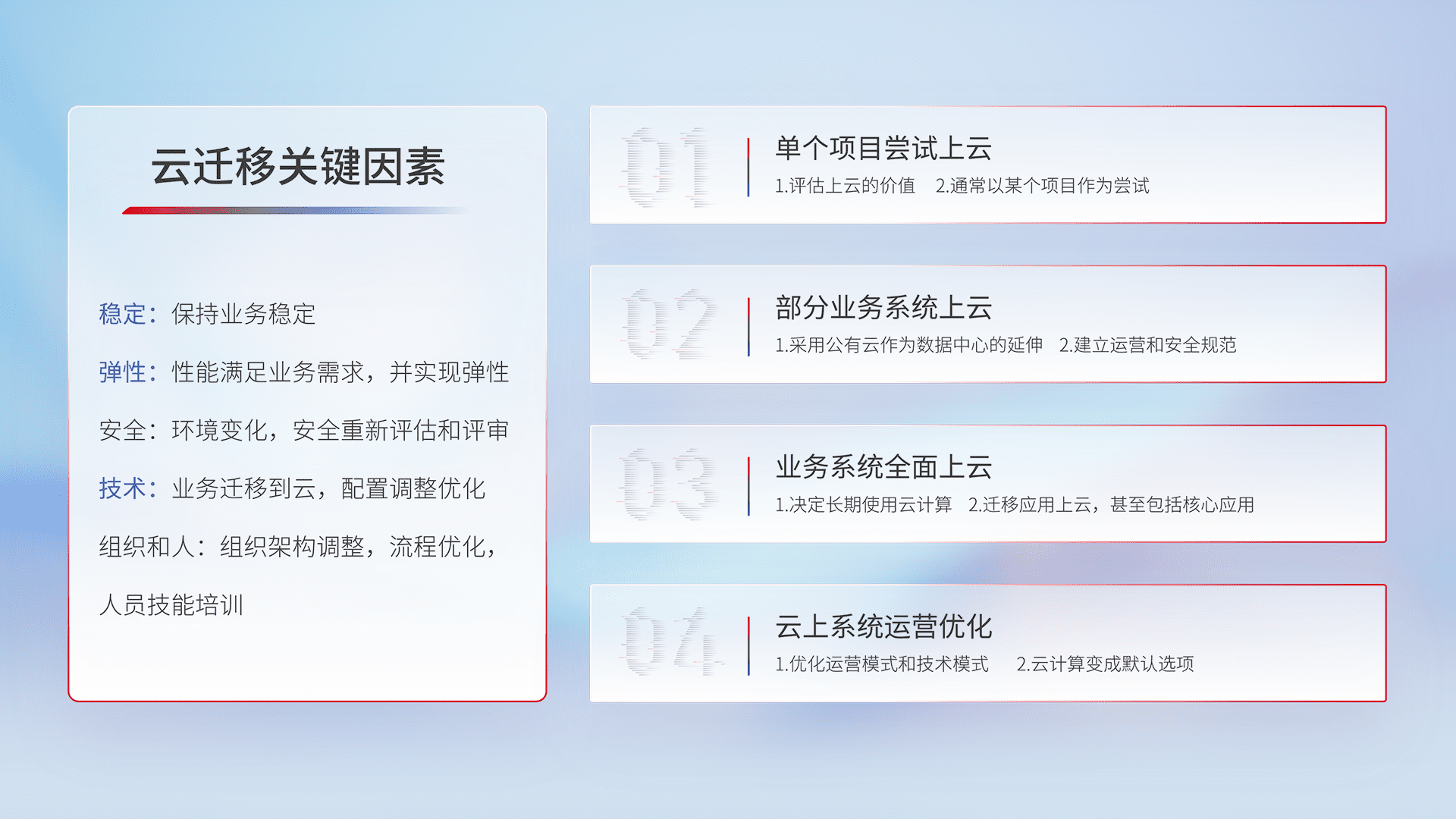 结合实际业务,,从规划设计、、云平台选型、、、云原生改造、、数据迁移、、集成交付,,,迁移全过程为客户识别最佳上云路径,,,,做好风险识别管理,,设计网络架构、、、、身份权限、、、、安全审计合规、、、、操作审计、、、、日志审计、、监控告警策略、、、多站点容灾设计等,,,,对云上基础设施进行整体规划,,提升IT治理水平,,,以满足弹性、、、高可用、、高性能的需求。。。。