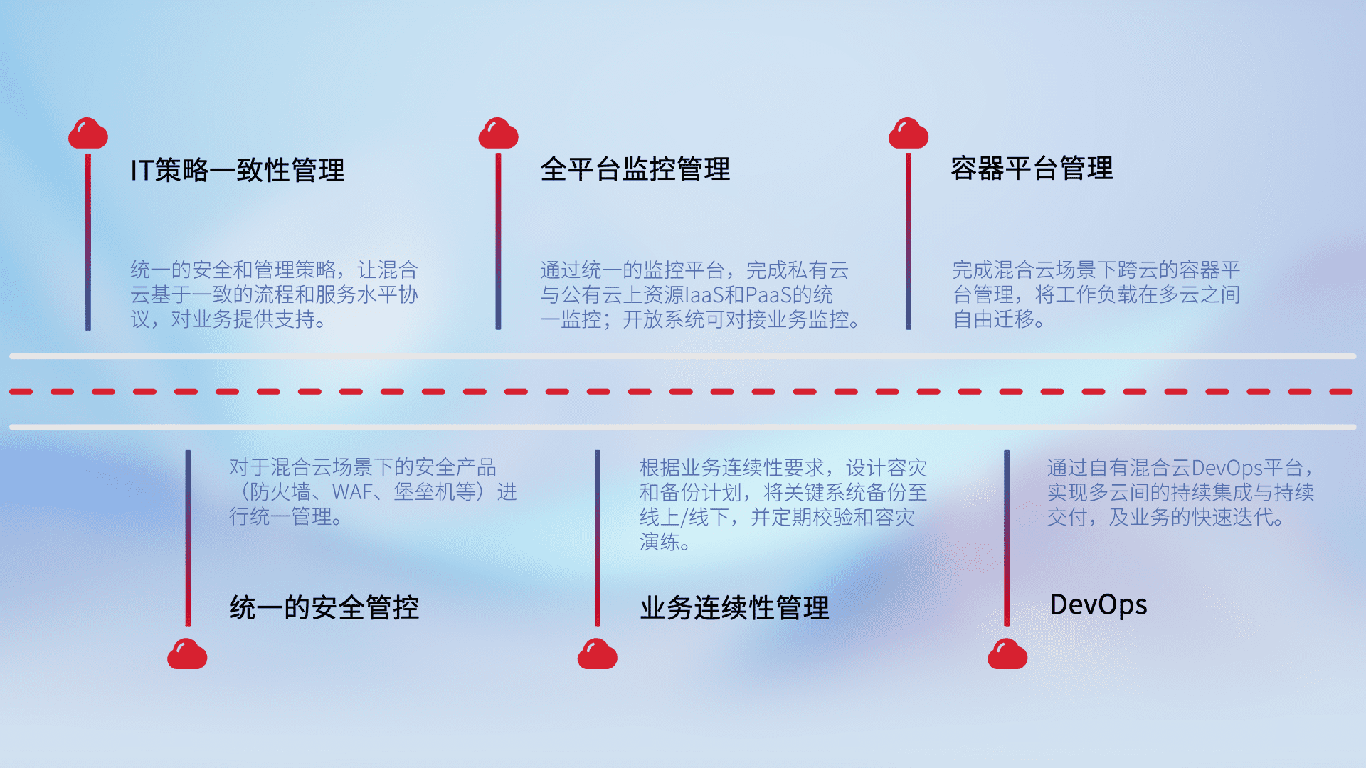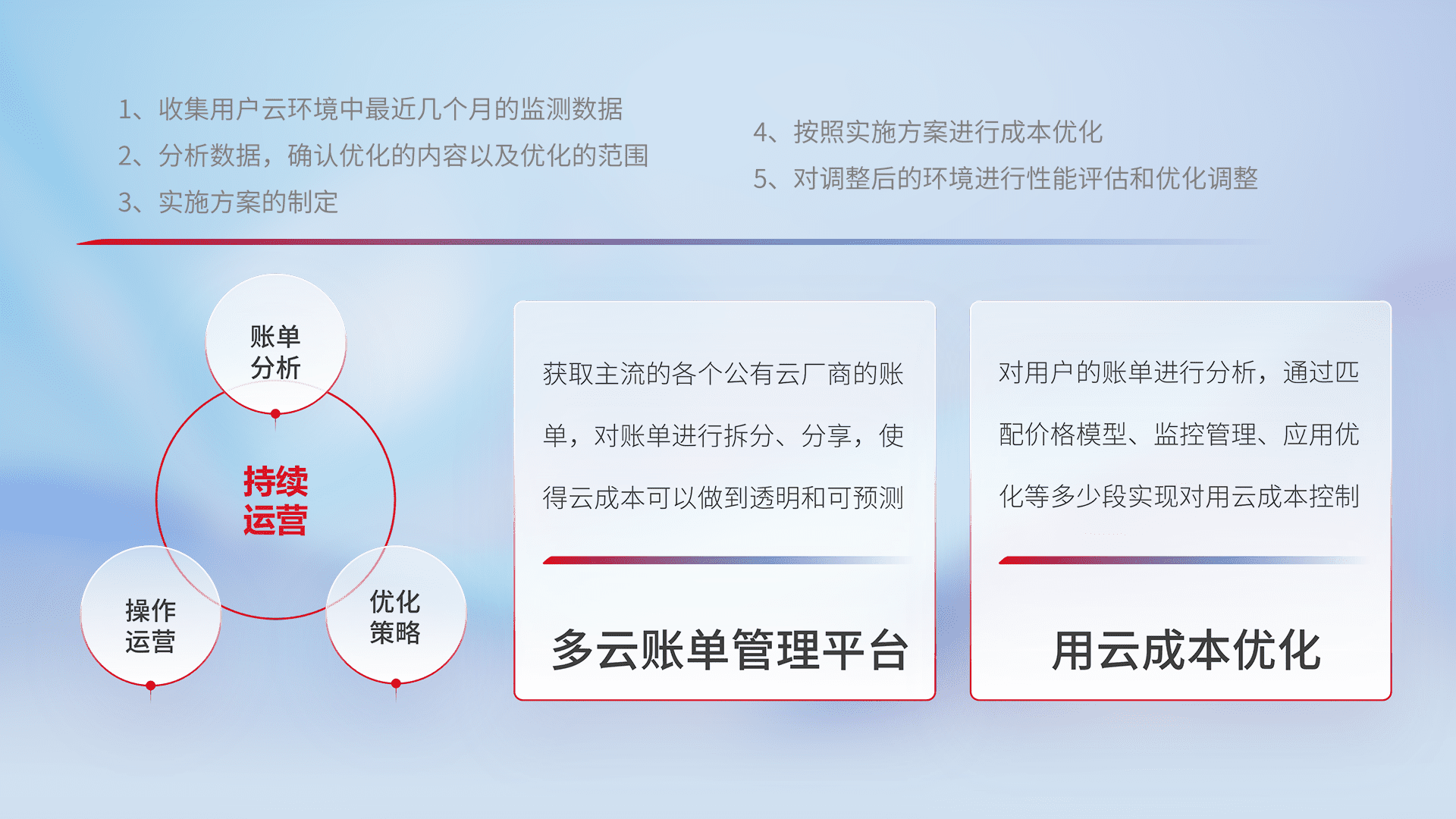 通过多云纳管,,以统一的资源数据模型把客户的云资源进行抽象和封装,,进而实现对多云资源的统一操作,,,,保障云资源管理的可靠性、、稳定性与可用性。。量身定制化运维内容,,,配置、、、开发运维、、、、补丁管理、、备份、、监控、、、认证和访问管理、、、、审计和日常巡检等,,保障在用云过程中的可靠度,,,稳定度以及高可用率。。