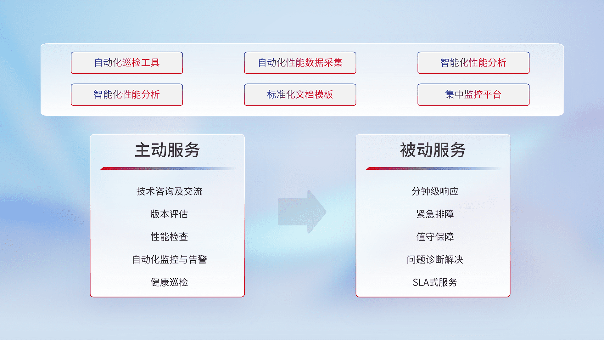 智能化工具和标准化文档,,,保障服务质量,,提供主动服务(包含技术咨询、、版本评估、、、性能检查、、、自动化监控与告警、、、、健康巡检)和被动服务包含(分钟级响应、、、、紧急排障、、、、值守保障、、问题诊断解决、、SLA服务)。。